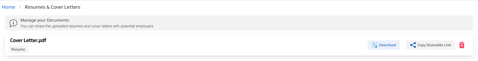 You can upload your cover letter and resume and share your resume with recruiters using the sharing link